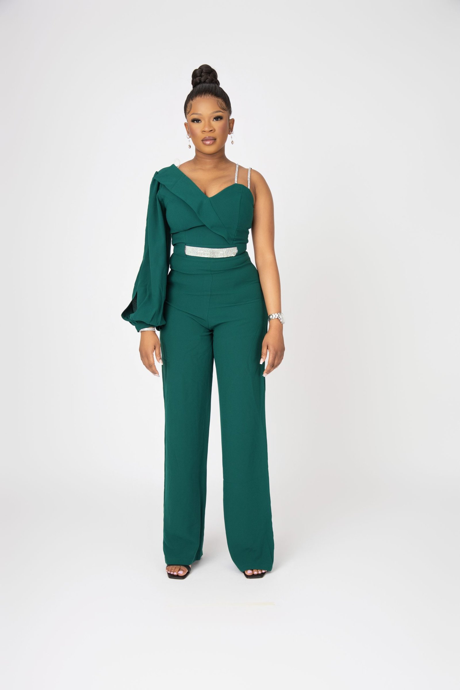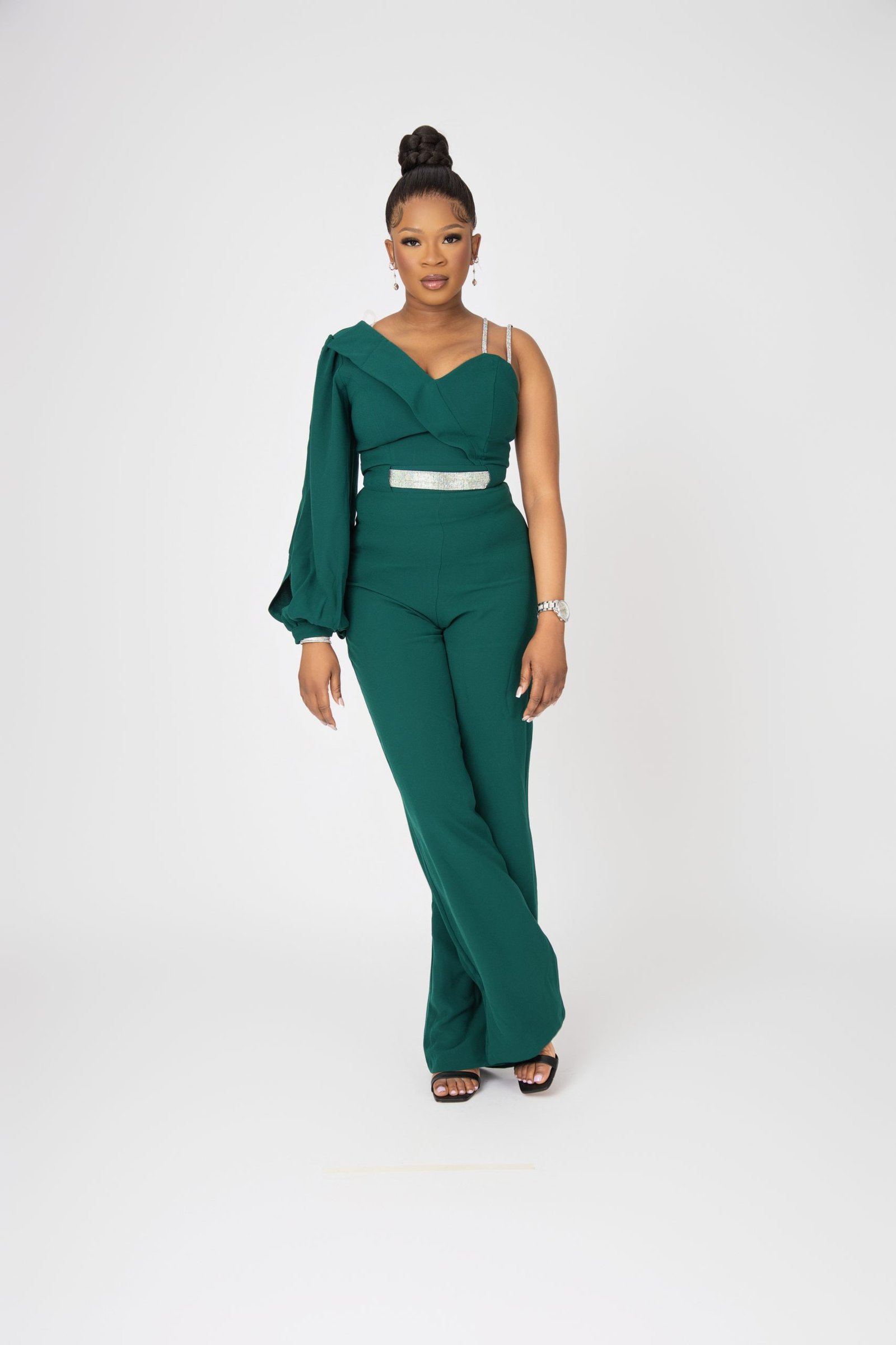 Command attention in the Bling Strap Jumpsuit, now in a vibrant emerald green. This sophisticated one-piece features sparkling embellished straps and a wide-leg silhouette that combines modern elegance with ultimate comfort. Ideal for gala dinners, weddings, or high-profile evening events. Crafted from premium fabric designed to drape beautifully and flatter every curve.