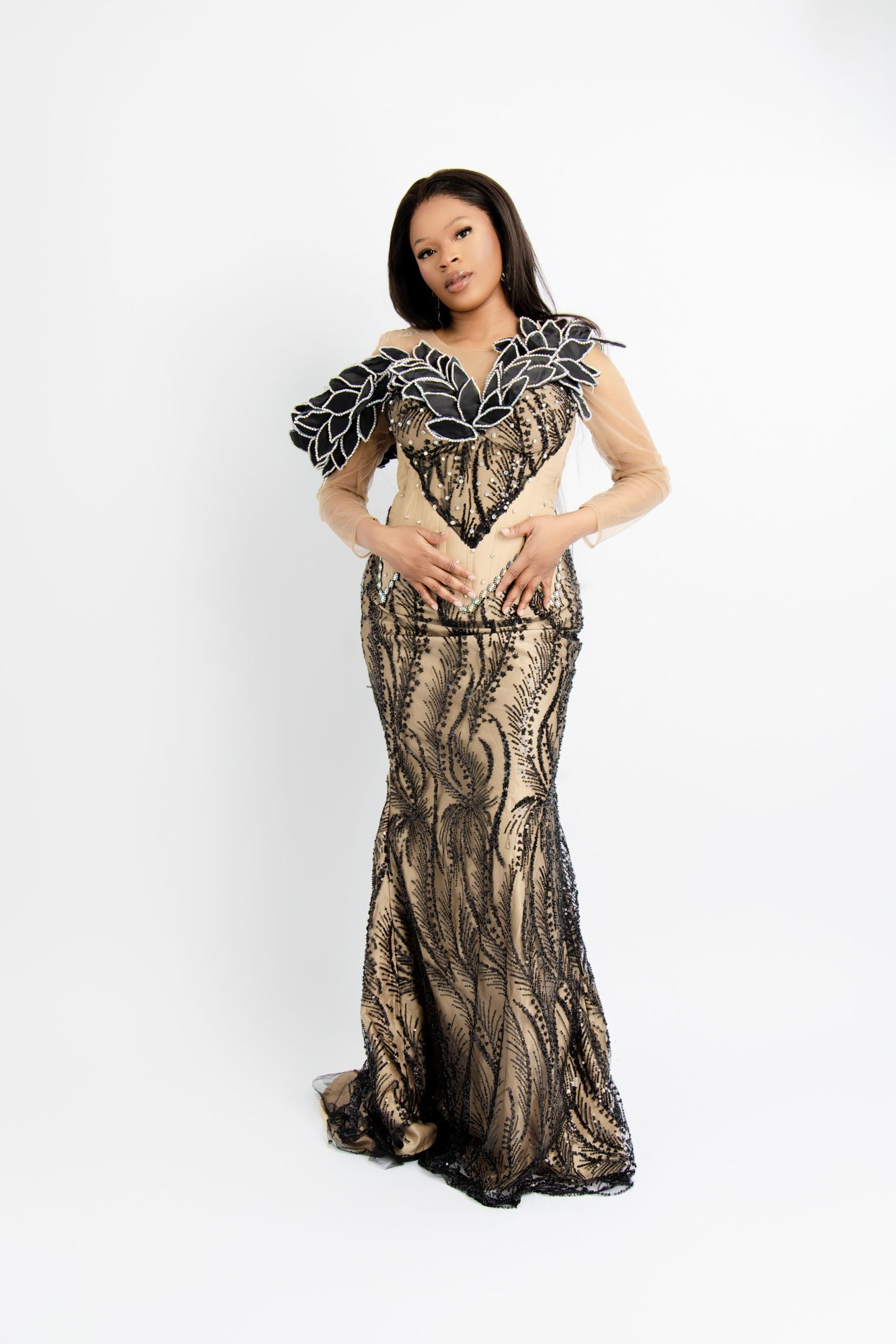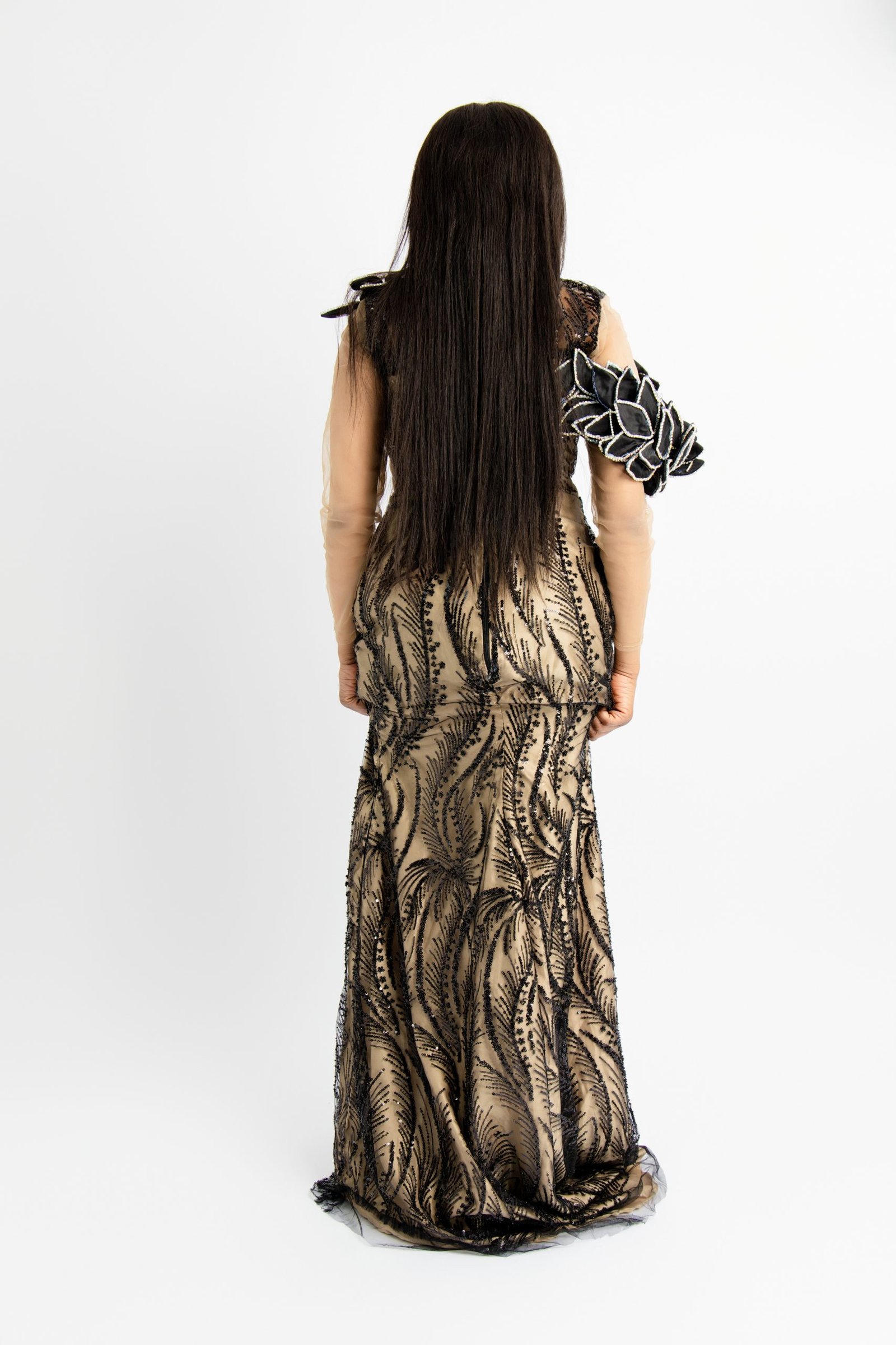 Experience the perfect blend of contrast and class with our Noir & Sand Bespoke Evening Gown. This custom-made black and beige masterpiece features a unique two-tone design, meticulously tailored to your exact measurements for a sophisticated and modern aesthetic. Crafted with premium fabrics, it ensures a flawless fit and a commanding presence at any high-end formal event or gala. Experience the luxury of a personalized high-fashion creation designed specifically for your most memorable moments. Available in multiple sizes.