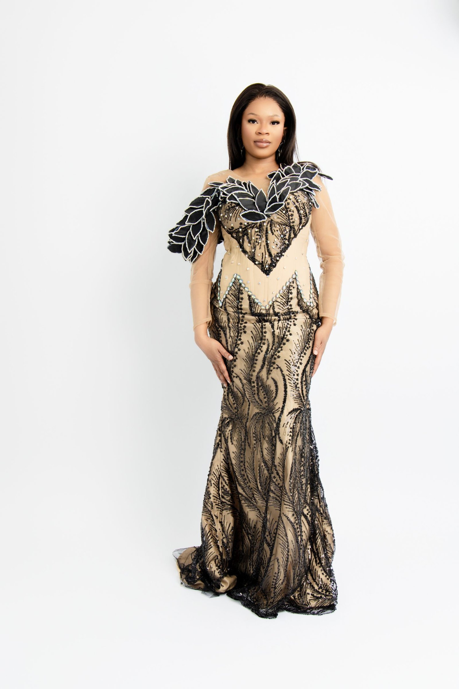Noir & Sand Bespoke Evening Gown – Sophisticated Two-Tone Custom Dress for Formal Events