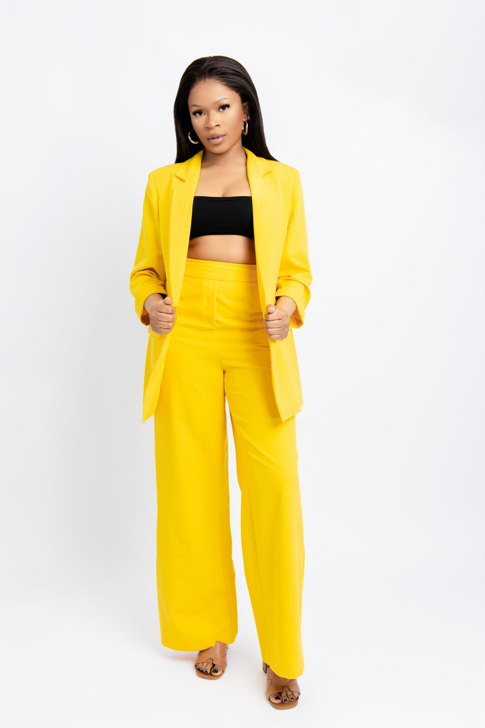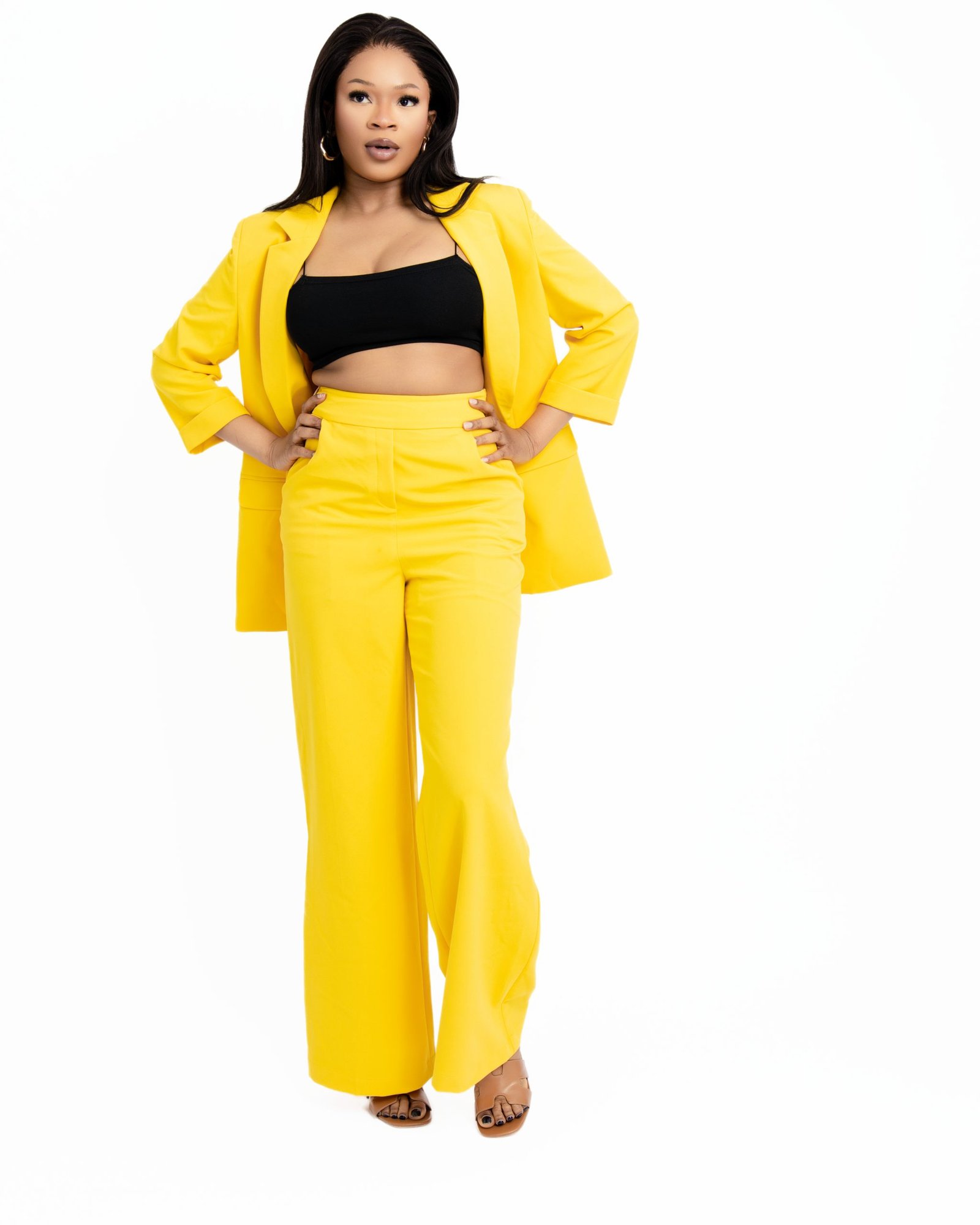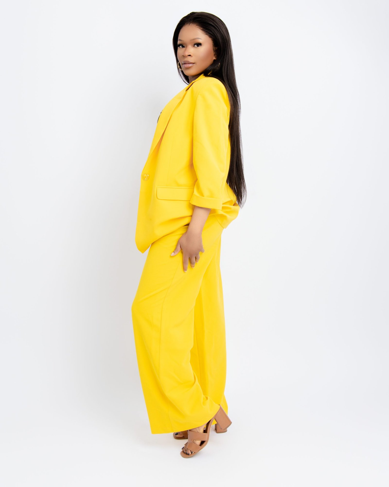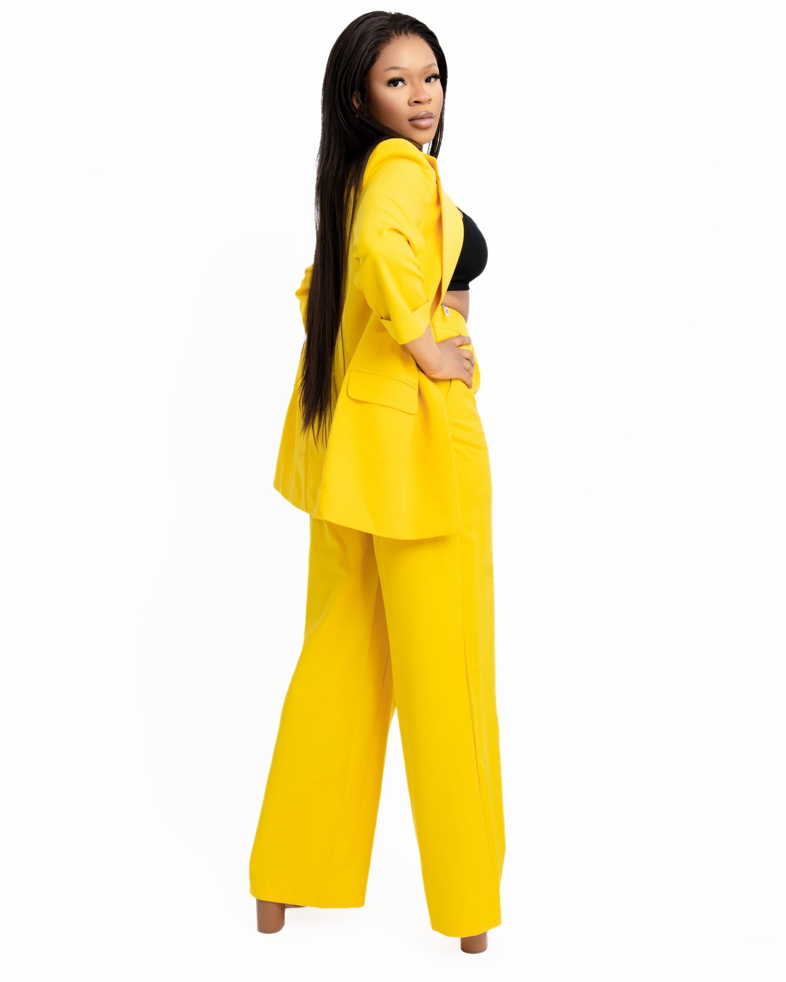 Command the room in our Sunshine Tailored Blazer Suit Set. This vibrant yellow ensemble features a meticulously tailored blazer and matching trousers, offering a bold and professional look for the modern woman. Crafted with high-quality fabric for a smooth finish and a sharp silhouette, it’s the perfect choice for corporate power dressing, high-end business meetings, or upscale social events. Experience the perfect blend of confidence and style with this radiant yellow power suit. Available in multiple sizes.