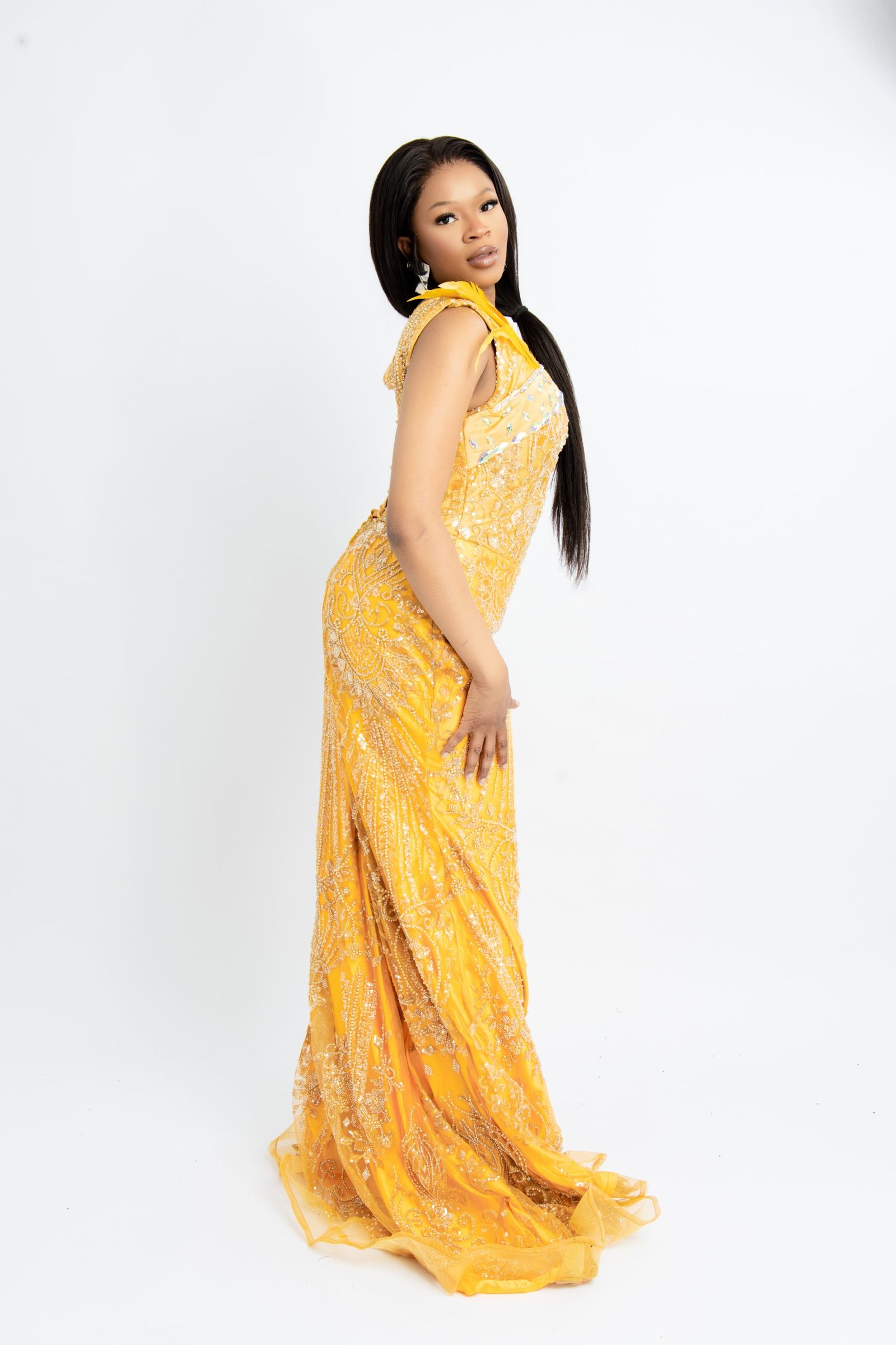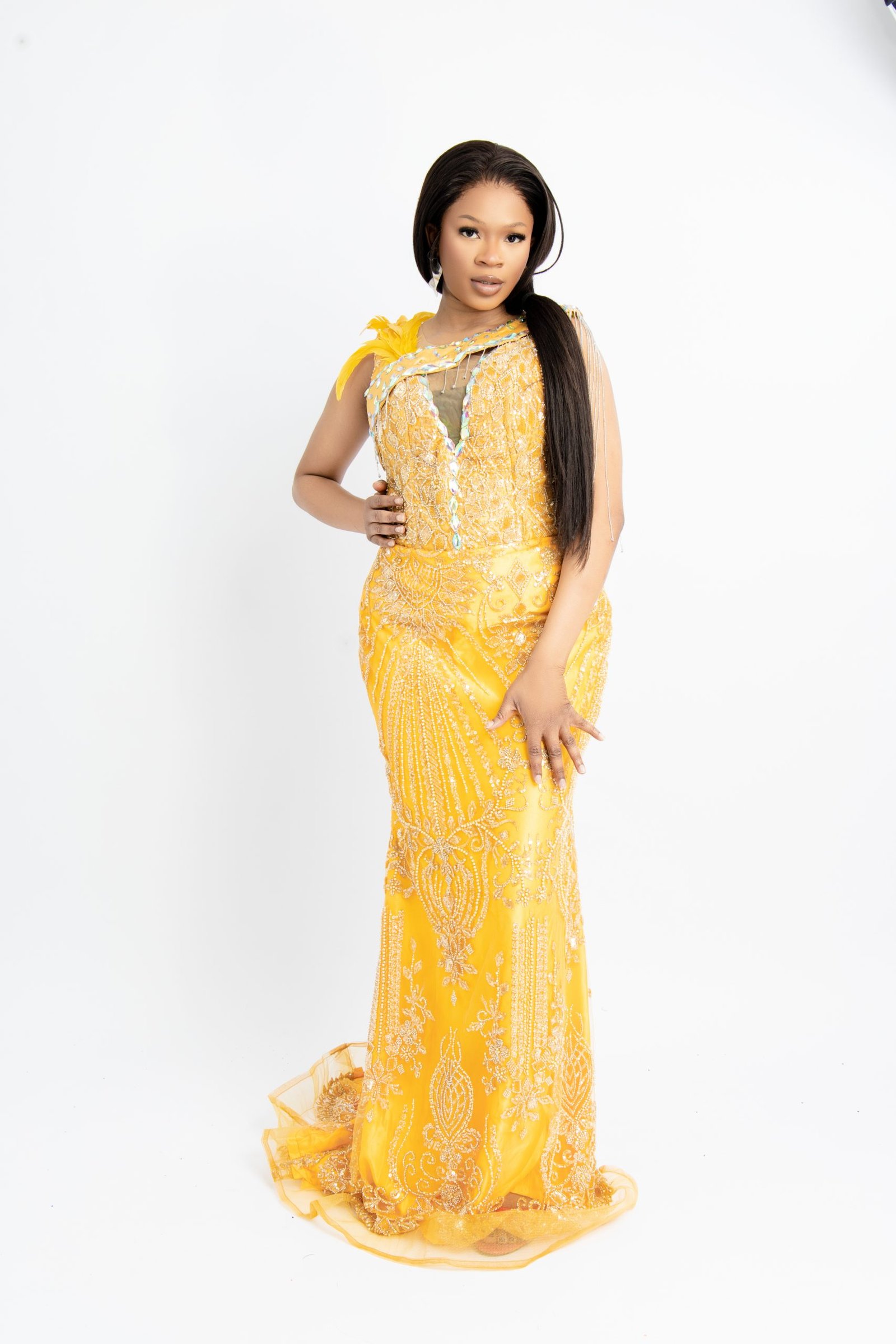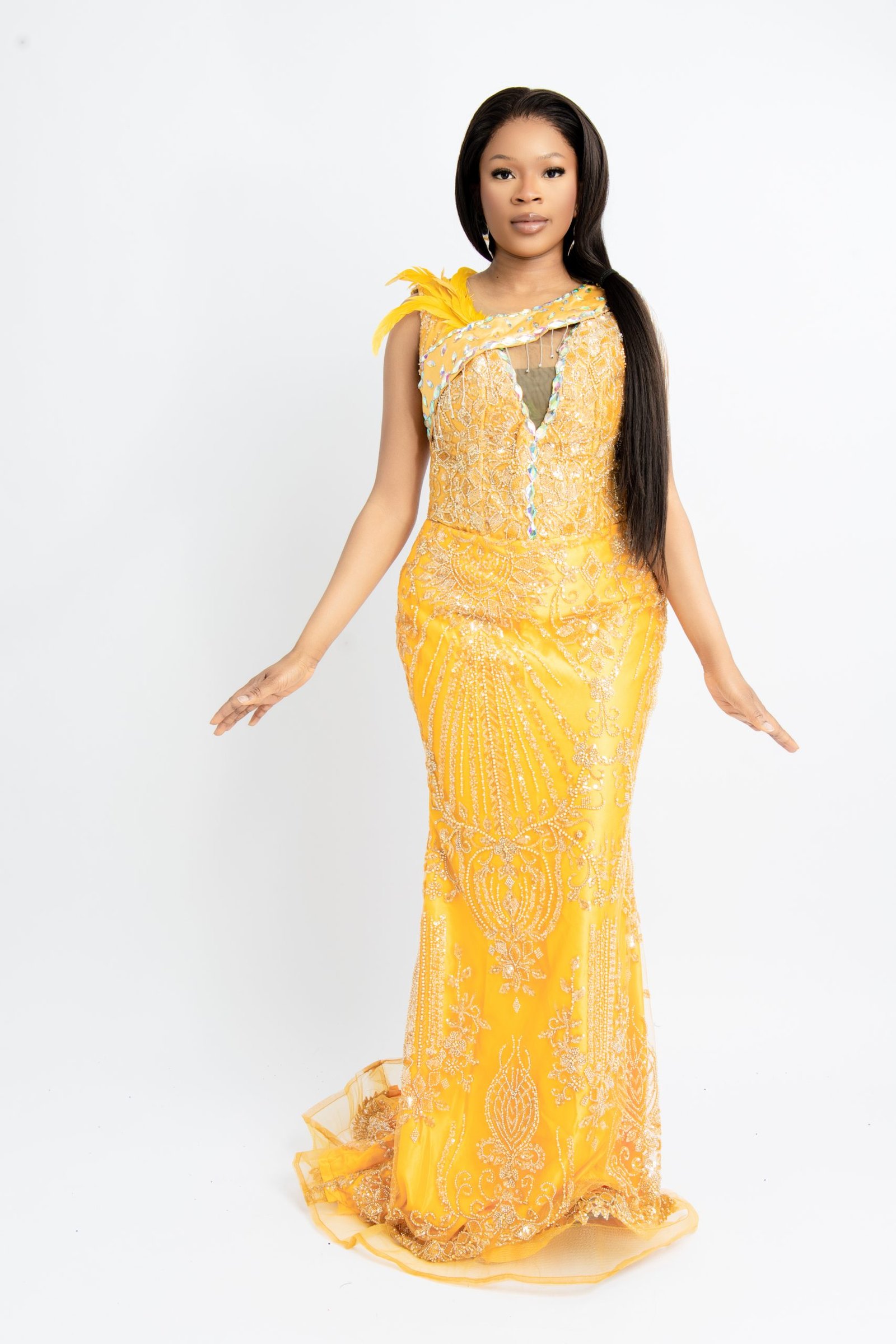 Make a grand and unforgettable entrance with our Bespoke Yellow Feather Evening Gown. This custom-made masterpiece is meticulously handcrafted, featuring delicate yellow feather accents and intricate detailing that radiates luxury and high-fashion flair. Tailored to perfection for your unique measurements, this gown offers a flawless fit and a silhouette that commands attention at prestigious galas, red carpet events, and special celebrations. The vibrant yellow hue combined with the soft texture of the feathers creates a truly show-stopping look. Experience the ultimate in personalized luxury with this one-of-a-kind bespoke creation. Available in sizes Medium and Large.